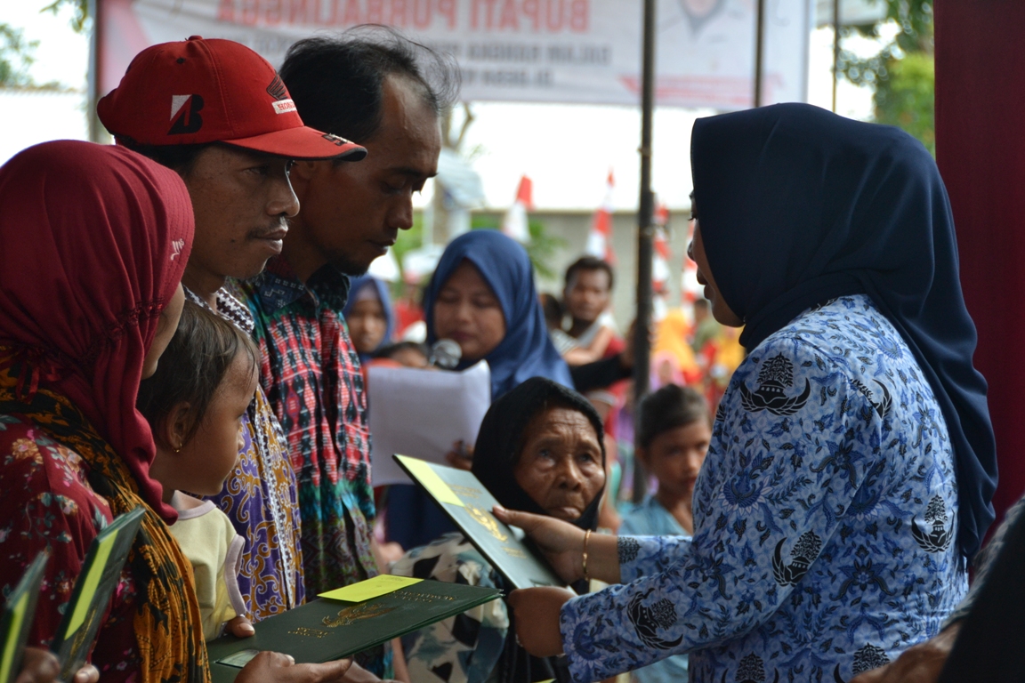 PURBALINGGA – Sertifikat sebanyak 1099 bidang tanah dari program Pendaftaran Tanah Sistim Lengkap (PTSL) di Desa Kasih, Kecamatan Kertanegara mulai dibagikan kepada masyarakat (pemilik), Jumat (29/11) di Balai Desa Kasih. Pembagian secara simbolis dilaksanakan oleh Bupati Purbalingga Dyah Hayuning Pratiwi SE BEcon MM didampingi pihak terkait dari Kantor Agraria dan Tata Ruang (ATR/BPN) Purbalingga.Camat Kertanegara, Sutrisno SSos mengungkapkan sebanyak 1099 bidang tanah di Desa Kasih telah berhasil diukur oleh pihak ATR/BPN. “Sebanyak 700 sertifikat diantaranya sudah dibagikan pada waktu sebelumnya. Kali ini diserahkan 200, dan sisanya sebanyak 199 masih dalam proses, dan akan segera jadi dalam waktu dekat,” katanya.