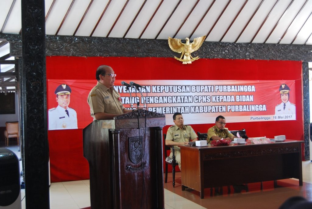 PURBALINGGA, DINKOMINFO – Sebanyak 127 bidan di lingkungan Pemerintah Kabupaten Purbalingga menerima Surat Keputusan (SK) Bupati Purbalingga tentang Pengangkatan Calon Pegawai Negeri Sipil (CPNS). Dari 136 Bidan Pegawai Tidak Tetap (PTT) yang mengikuti seleksi CPNS di Politeknik Kesehatan (Poltekkes) Semarang terjaring 127 bidan yang lolos seleksi CPNS. 136 peserta seleksi CPNS mengikuti Test Kompetensi Dasar yang dilaksanakan pada tanggal 19 – 24 Juli 2016 dan 11 Agustus 2016.