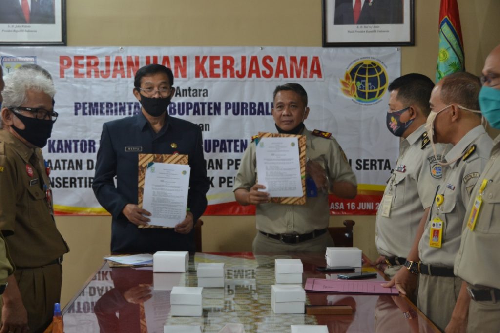 Kerjasama tersebut ditandai dengan penandatanganan dokumen Perjanjian Kerjasama oleh Sekda, Wahyu Kontardi SH dan Kepala Kantor Pertanahan Kabupaten Purbalingga, Karsono APtnh SH MSi, Selasa (16/6) di Ruang Kerja Sekda.