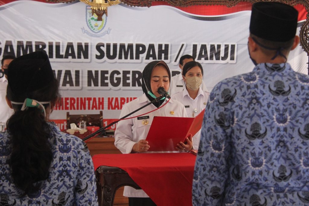 “Panjenengan-panjenengan semestinya diambil sumpah/janji pada 1 Maret 2020 lalu, namun karena adanya pandemi Covid-19 baru dapat dilaksanakan hari ini, tanggal 1 Juli 2020.” kata Bupati Purbalingga Dyah Hayuning Pratiwi SE BEcon MM., di pendapa Dipokusumo, Rabu (1/7).