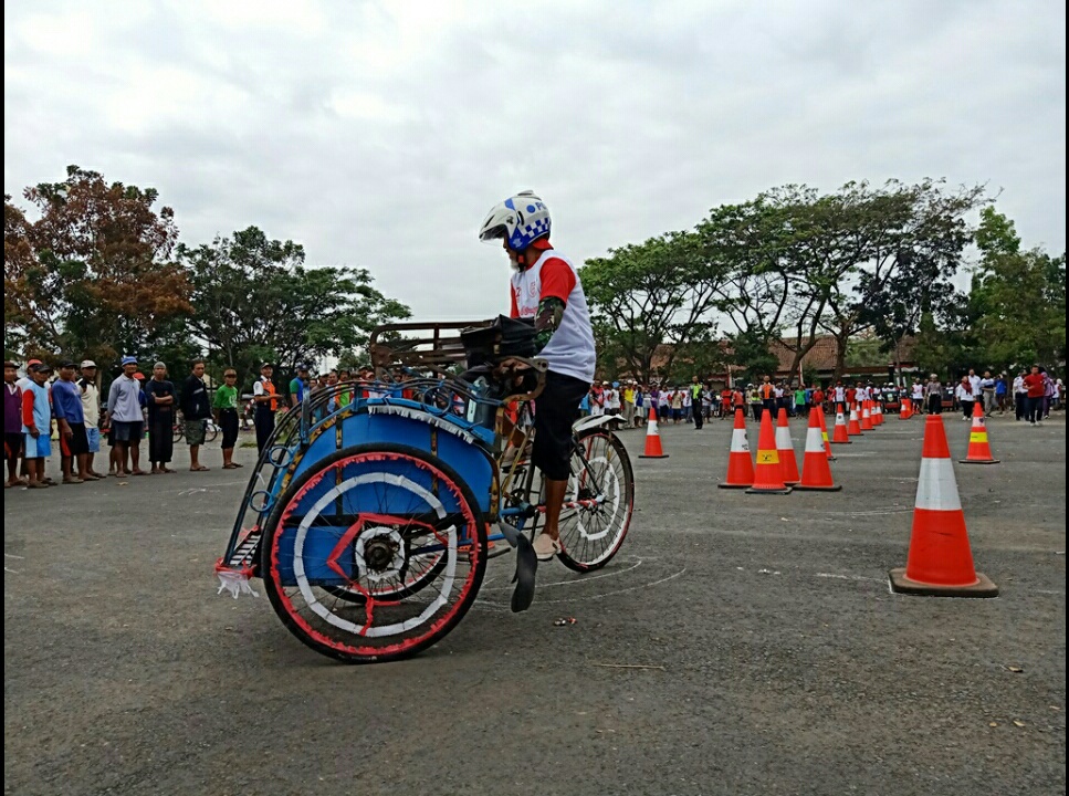 Purbalingga – Sebanyak 60 abang becak mengikuti lomba ketangkasan mengemudi becak. Lomba yang diselenggarakan oleh Dinas Perhubungan Purbalingga bekerjasama dengan Satuan Lalu Lintas (Satlantas) Polres Purbalingga berlangsung di GOR Goentur Darjono, Minggu (25/8).