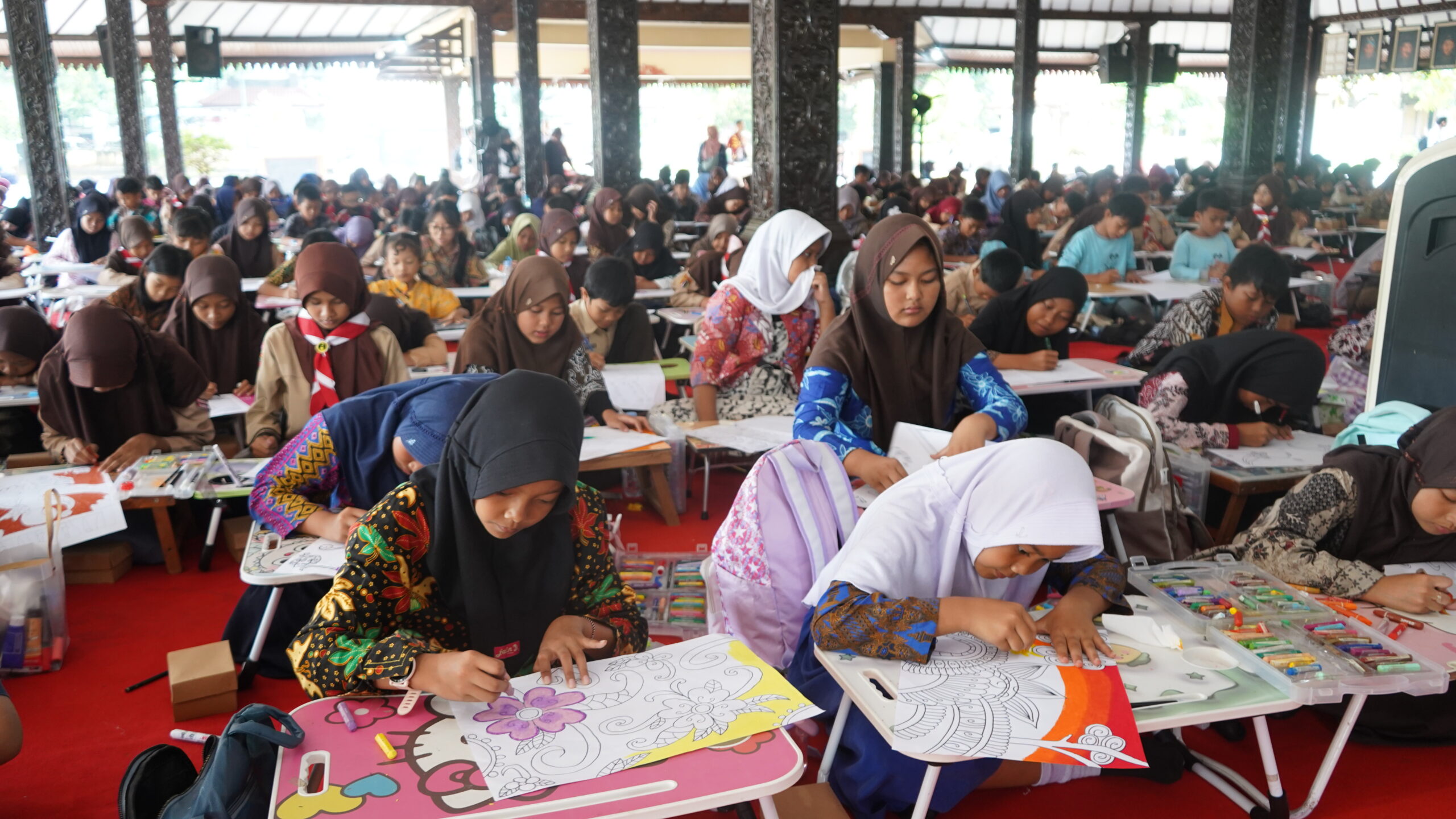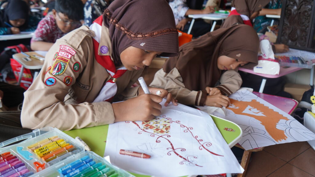 Peserta tampak antusias mengekspresikan kreativitas mereka melalui karya bertema batik. Dengan penuh semangat, anak-anak mewarnai dan melukis berbagai motif khas batik Nusantara sebagai bentuk kecintaan terhadap warisan budaya bangsa.