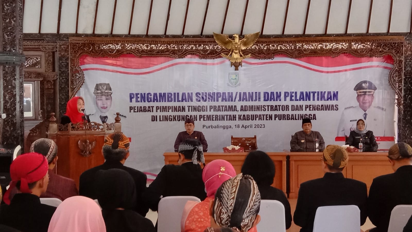 PURBALINGGA INFO- Sebanyak 78 pejabat struktural di lingkungan Pemerintah Kabupaten (Pemkab) Purbalingga dilantik oleh Bupati Purbalingga Dyah Hayuning Pratiwi, SE., B.Econ., MM Selasa (18/4/2023) di Pendapa Dipokusumo Purbalingga. Acara yang juga diikuti Wakil Bupati Bupati H. Sudono, ST., MT, Ketua DPRD HR Bambang Irawan, SH., MM dan Sekda Herni Sulasti, SH., MH., C.Fra itu melantik Jabatan Pimpinan Tinggi Pratama, Administrator dan Pengawas.