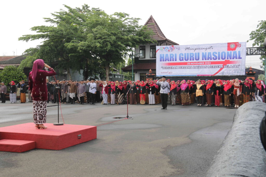 PURBALINGGA – Penerapan Asesmen Nasional sebagai efek dari penghapusan Ujian Nasional bertujuan agar pendidik berfokus menciptakan lingkungan belajar yang aman, inklusif, dan menyenangkan. Hal tersebut disampaikan oleh Bupati Purbalingga, Dyah Hayuning Pratiwi ketika membacakan Pidato Menteri Pendidikan, Kebudayaan, Riset, dan Teknologi Republik Indonesia Nadiem Anwar Makarim dalam rangka Upacara peringatan Hari Guru Nasional Tahun 2023, Sabtu (25/11) bertempat di halaman Pendopo Dipokusumo Kabupaten Purbalingga.