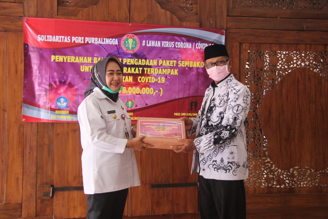 “Hari ini tidak, pemerintah Kabupaten Purbalingga tidak saja menerima bantuan berupa APD dan Masker, namun PGRI beserta jajarannya memberikan bantuan untuk Jaring Pengaman Sosial, khususnya bakul-bakul yang ada di sekolah,” jelasnya.