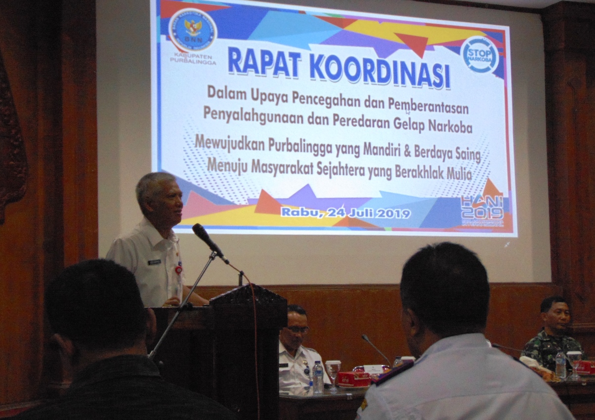 PURBALINGGA- Salah satu cara pencegahan terjadinya kejahatan adalah mencegah kesempatan dengan membatasi peluang terjadinya tindakan. Termasuk pada kejahatan narkoba yang masuk kategori kejahatan luar biasa (extra ordinary crimes), dibutuhkan langkah-langkah pencegahan yang komprehensif diantaranya adalah pembentukan satuan tugas (SATGAS) di masing-masing wilayah dan komunitas untuk memberikan sosialisasi pencegahan penyalahgunaan narkoba di lingkungannya. Hal itu disampaikan Bupati Purbalingga melalui Asisten Ekonomi Dan Pembangunan Sekda Purbalingga Drs Agus Winarno MSi saat memberikan sambutannya pada acara Rapat Koordinasi Program Pemberdayaan Masyarakat Anti Narkoba Bersama Instansi Pemerintah Dan Lingkungan Swasta di Operation Room Graha Adiguna Sekretariat Daerah Kabupaten Purbalingga.