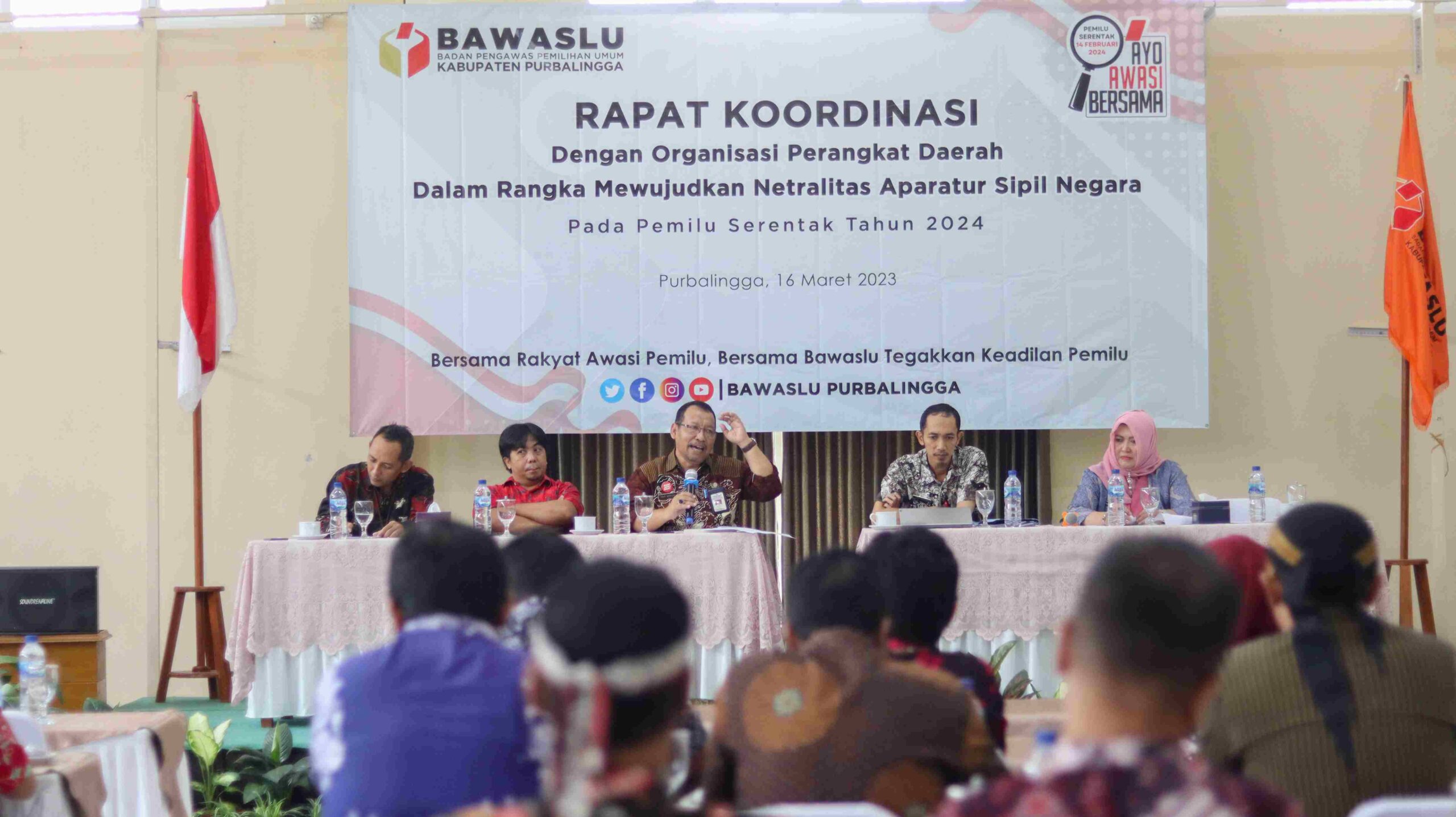 PURBALINGGA, INFO – Netralitas Aparatur Sipil Negara (ASN) harus dijaga saat Pemilihan Umum (Pemilu) serentak tahun 2024. Untuk itu, Badan Pengawas Pemilu (Bawaslu) Kabupaten Purbalingga mengadakan Rapat Koordinasi (Rakor) dengan para pimpinan Perangkat Daerah di Tien Catering, Kamis (16/3).