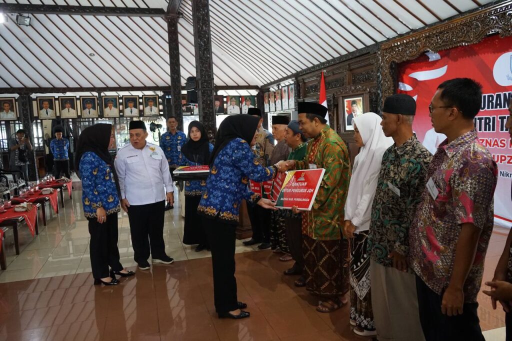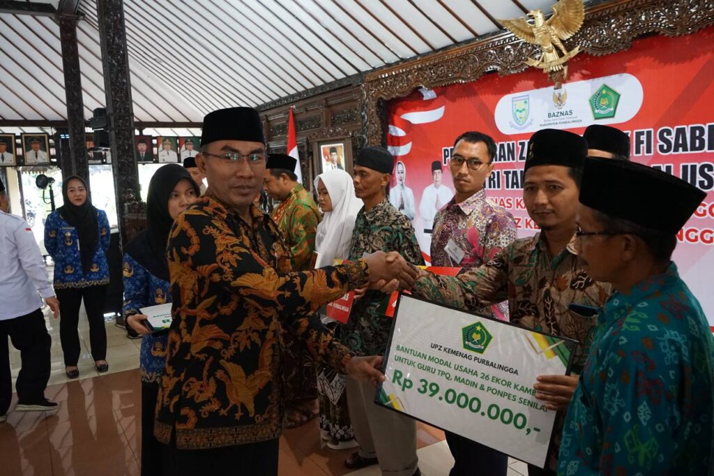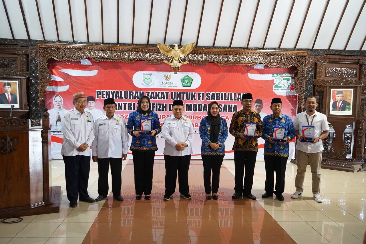 PURBALINGGA INFO – Badan Amil Zakat Nasional (Baznas) Kabupaten Purbalingga bekerjasama dengan Unit Pengumpul Zakat (UPZ) Kantor Kementerian Agama Kabupaten Purbalingga menyalurkan bersama bantuan untuk Sabilillah, Santri Tahfidz, dan Modal Usaha. Penyaluran atau pentasarufan bantuan dilaksanakan di Pendopo Dipokusumo Kabupaten Purbalingga, Rabu, (17/1/24)