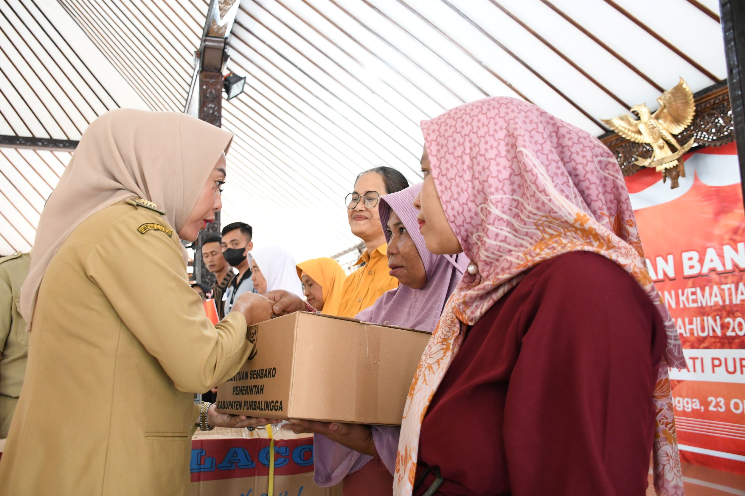 PURBALINGGA – Bupati Purbalingga Dyah Hayuning Pratiwi menyerahkan aneka bantuan sosial (bansos) kepada warga yang berhak menerima dan membutuhkan. Bansos ini diantaranya BLT untuk petani tembakau, buruh pabrik rokok/vape, bansos untuk orang dengan kecacatan berat (ODKB), santunan kematian keluarga fakir miskin, santunan penderes jatuh, bantuan kursi roda, sembako lansia, sembako disabilitas, dan bansos operasional untuk lembaga kesejahteraan sosial (LKS/panti).