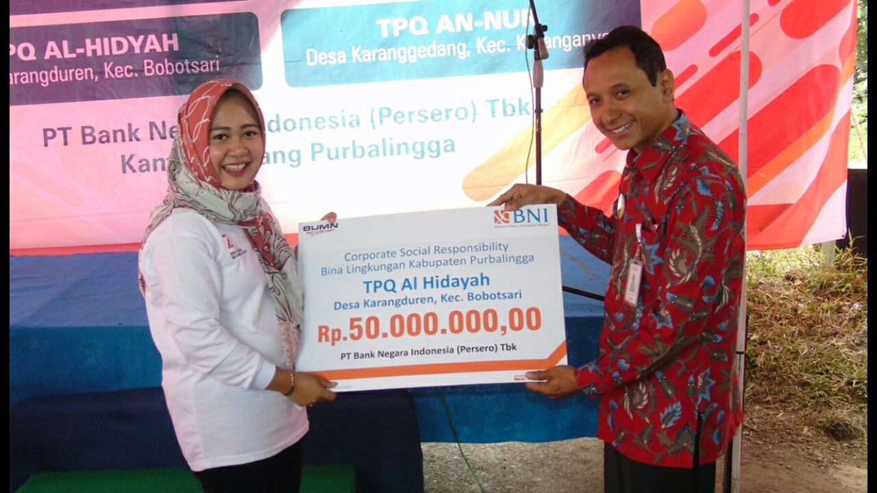 PURBALINGGA – PT Bank Negara Indonesia (BNI) Persero memberikan bantuan Corporate Social Responsibility (CSR) kepada Tempat Pendidikan Al-Quran (TPQ) Al-Hidayah Desa Karangduren, Kecamatan Bobotsari sebesar Rp 50 juta, Kamis (22/8). Pemberian ini merupakan tindaklanjut dari upaya Menteri BUMN yang datang ke Purbalingga beberapa waktu lalu agar para BUMN memberikan kepedulian, perhatian kepada lingkungan sekitar.