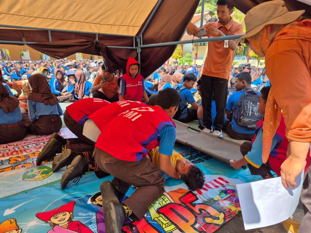 PURBALINGGA INFO – Suasana mendadak panik di SMPN 1 Bukateja, Jumat (25/4/25), ketika gempa bumi bermagnitudo 5,9 mengguncang selama 59 detik. Sebanyak 18 siswa mengalami luka ringan hingga berat. Tim medis sekolah segera memberikan pertolongan pertama, disusul oleh petugas dari BPBD (Badan Penanggulangan Bencana Daerah) Purbalingga. Dua siswa dengan luka berat dilarikan ke rumah sakit menggunakan ambulans BPBD. Sementara ratusan siswa lainnya dikumpulkan di lapangan sekolah sambil menunggu dijemput oleh keluarganya.