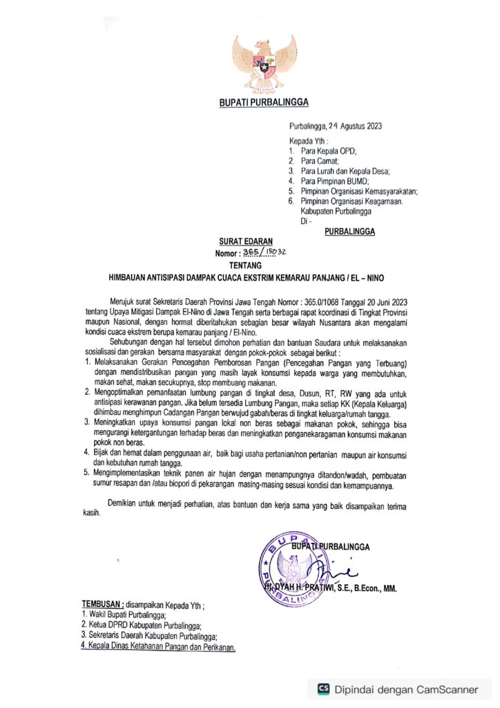 Surat edaran Bupati Purbalingga terkait antisipasi dampak musim kemarau Panjang/ El-Nino.
