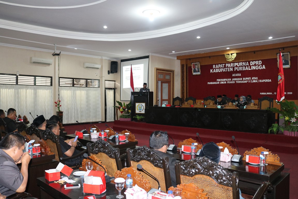 Rapat paripurna jawaban Bupati atas pandangan umum fraksi DPRD tersebut membahas lima raperda yaitu raperda tentang penyertaan modal PT BPRS Buana Mitra Perwira, raperda tentang pembubaran perusahaan daerah Purbalingga, Ventura, raperda tentang pengelolaan barang milik daerah, raperda tentang perubahan perda Purbalingga no 4 tahun 2018 tentang kedudukan keuangan kepala Desa dan Perangkat Desa, raperda tentang pencabutan Perda no 8 tahun 2010 tentang kependudukan. (KP-4).