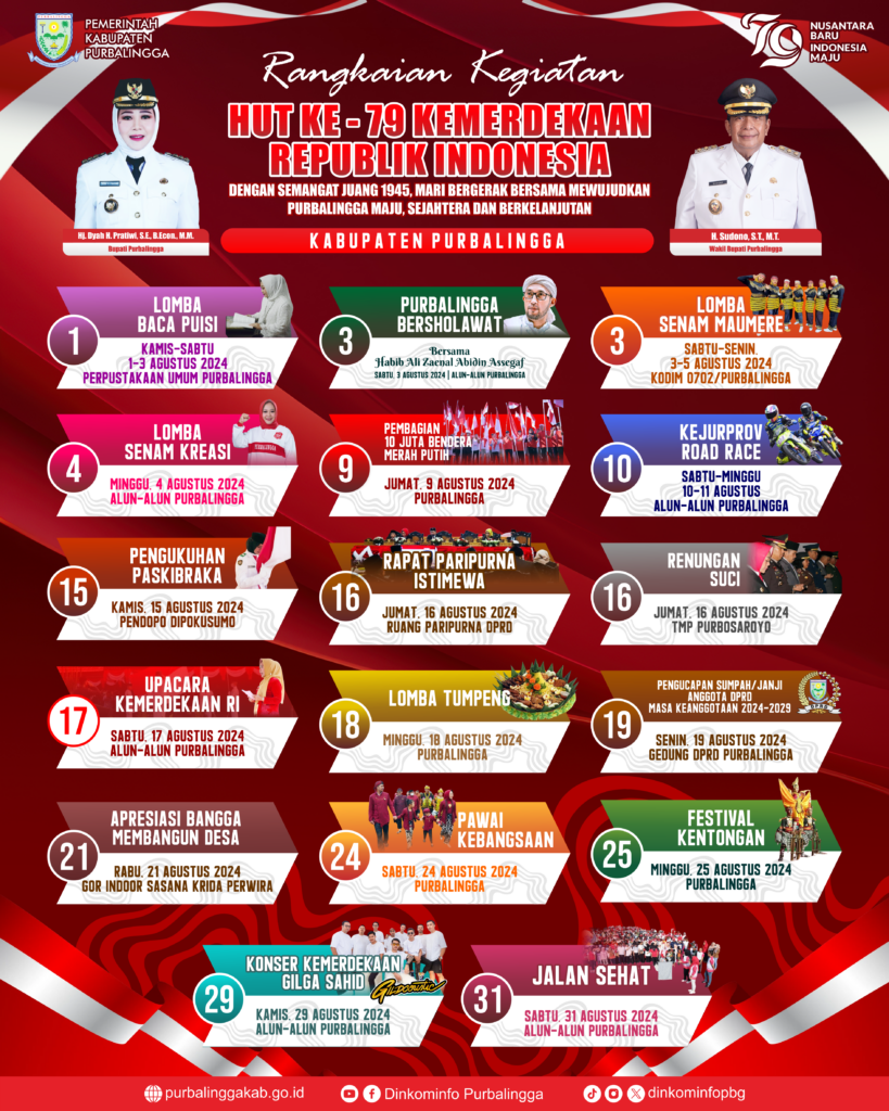 Untuk diketahui, rangkaian kegiatan Hari Ulang Tahun Kemerdekaan Republik Indonesia yang ke-79 tahun 2024 bisa dipantau pada Instagram Dinkominfo Purbalingga @dinkominfopbg atau bisa di klik pada tautan berikut https://www.instagram.com/dinkominfopbg/