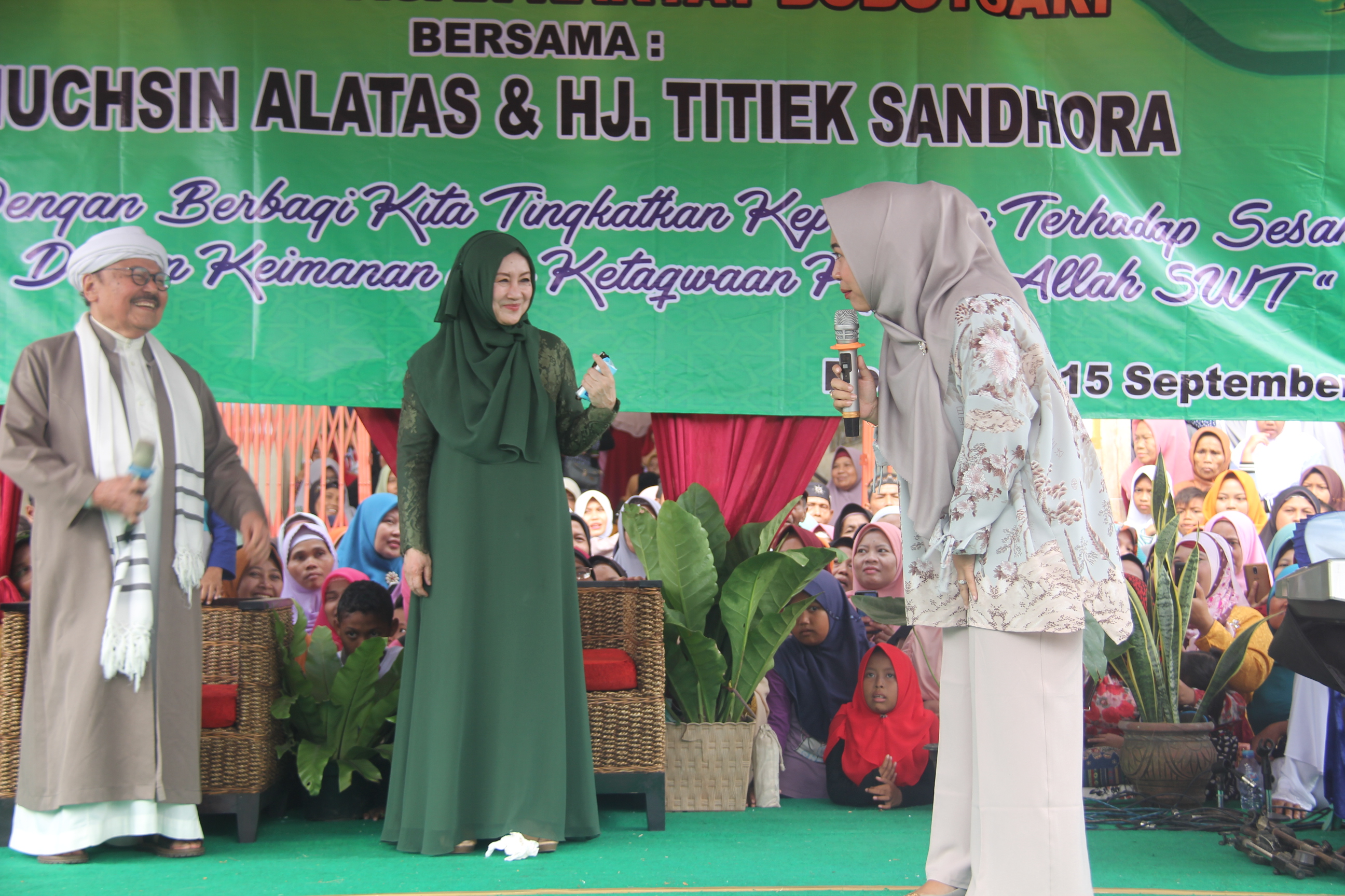 Ketua panitia pengajian akbar dan santunan anak yatim piatu Majlis Ta’lim Al Iman, Hj Suhartini dalam laporannya mengatakan, kegiatan ini rutin dilakukan setiap tahun, kali ini mengundang pasangan H Muksin Alatas bersama Hj Titiek Sandora. Dalam tahun ini, berhasil terkumpul Rp. 75 juta dari para pedagang pasar Bobotsari. Uang sebesar ini diberikan bagi 400 anak yatim piatu dan 100 kaum duafa.