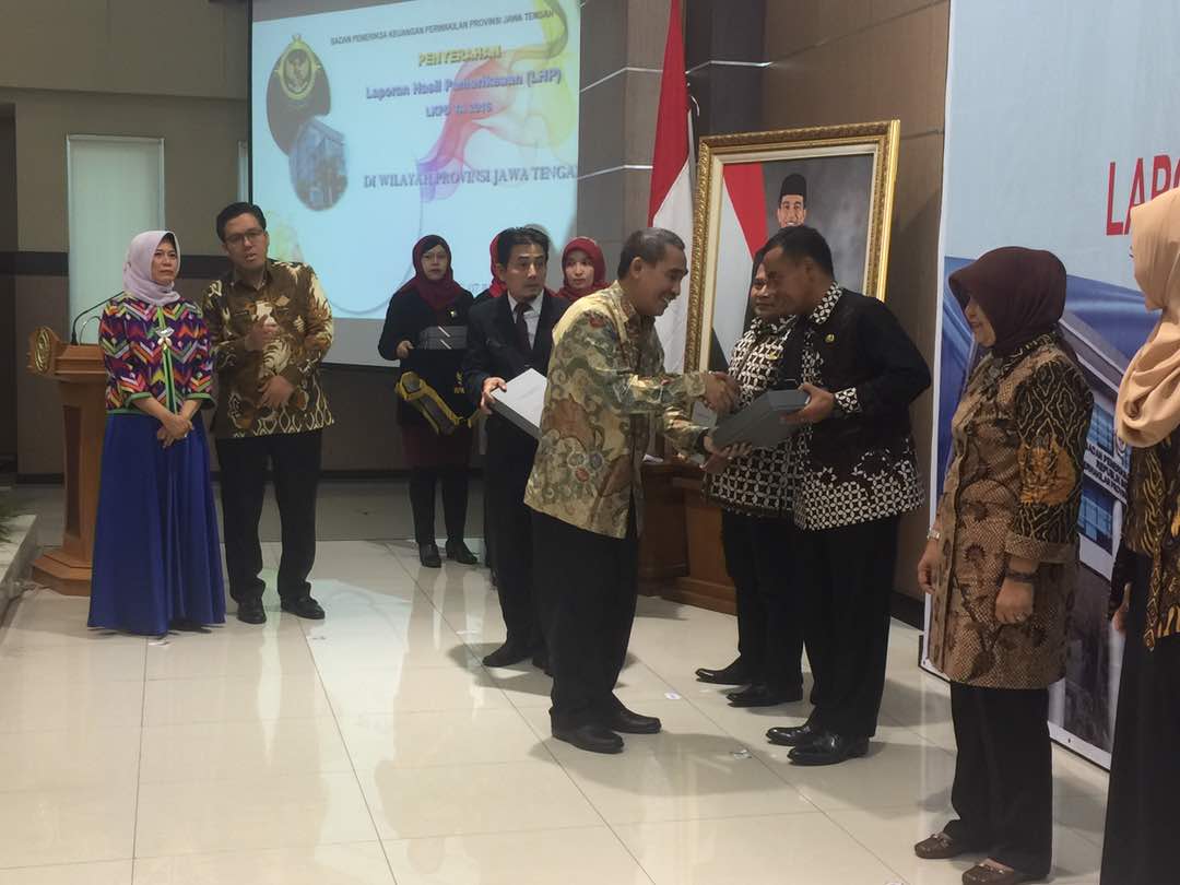 Penyerahan dilakukan oleh Kepala Perwakilan Badan Pemeriksa Keuangan Jawa Tengah Hery Subowo, dan disaksikan oleh anggota V BPK RI Isma Yatim di Auditorium BPK Perwakilan Jawa Tengah, Rabu (7/6). Selain menyerahkan penghargaan WTP, BPK juga menyerahkan Laporan Hasil Pemeriksaan (LHP) LKPD 4 Kabupaten/kota yang meraih Wajar Dengan Pengecualian (WDP) dan 1 Pemda masih dalam penyelesaian laporan.