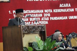 “Kami sampaikan terima kasih dan penghargaan tinggi kepada semua fraksi yang telah memberikan pandangan dan masukannya, dan menurut kami hal itu menjadi referensi positif dan berharga dalam penyempurnaan konsep Raperda dan peningkatan penyelenggaraan pemerintahan,” kata Bupati Tasdi saat sambutannya pada Rapat Paripurna Penandatangannan Nota Kesepakatan tentang KUA dan PPAS tahun 2018 dan Jawaban Bupati Atas Pandangan Umum Fraksi terhadap 6 Raperda, di ruang rapat Paripurna DPRD Purbalingga, Senin siang (06/11).