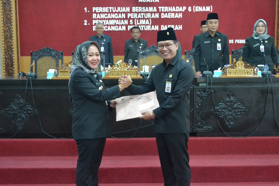 PURBALINGGA – Pemkab Purbalingga melalui Bupati Purbalingga Dyah Hayuning Pratiwi SE BEcon MM menyerahkan 5 Rancangan Peraturan Daerah (Raperda) kepada Ketua DPRD Purbalingga untuk dibahas lebih lanjut, Rabu (5/2) di Ruang Rapat DPRD. Lima raperda tersebut diantaranya : Raperda Tentang Penyertaan Modal Pemerintah Daerah Pada PT BPR Syariah Buana Mitra Perwira; Raperda Tentang Pembubaran Perusahaan Daerah Purbalingga Ventura; Raperda Tentang Pengelolaan Barang Milik Daerah; Raperda Tentang Perubahan Atas Peraturan Daerah Nomor 4 Tahun 2018 Tentang Kedudukan Keuangan Kepala Desa Dan Perangkat Desa; dan Raperda Tentang Pencabutan Peraturan Daerah Kabupaten Purbalingga Nomor 08 Tahun 2010 Tentang Kependudukan.