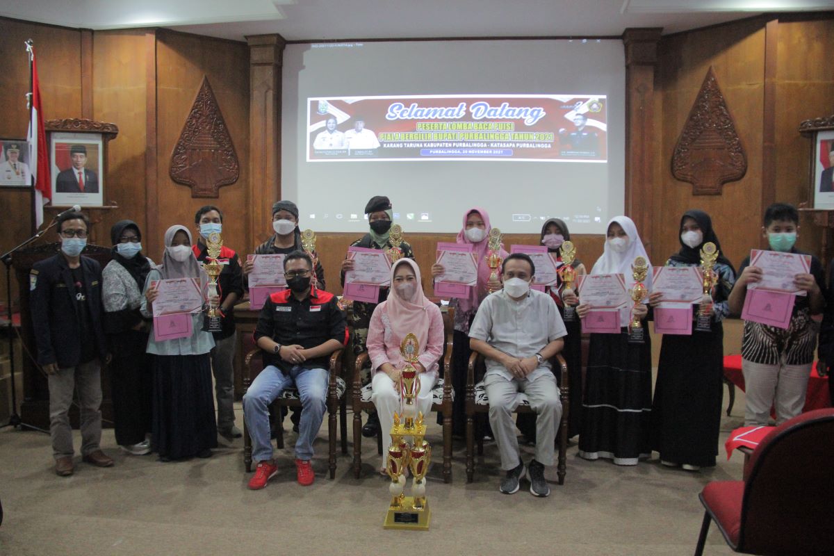 PURBALINGGA_Bupati Purbalingga Dyah Hayuning Pratiwi SE BEcon MM menyerahkan piala bergilir Bupati Purbalingga dan piala tetap juara 1 Lomba Baca Puisi tingkat SMP MTs se-eks karesidan Banyumas yang diselenggarakan oleh Karang Taruna Purbalingga – Katasapa dalam rangka Bakti Karang Taruna Tahun 2021. Kegiatan lomba baca puisi merupakan kegiatan rutin dalam rangka memperingati hari Bakti Karang Taruna sekaligus Hari Pahlawan.