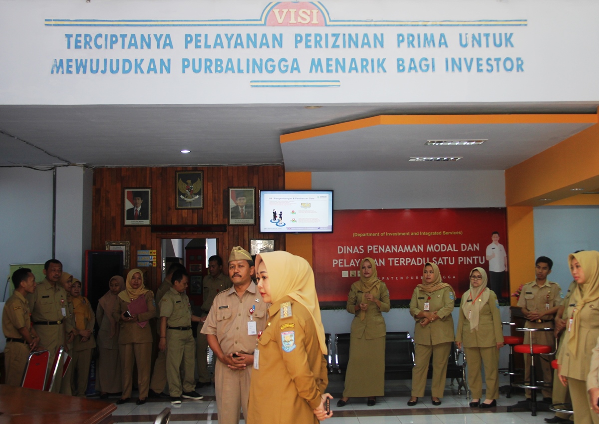 Kepada Camat Kaligondang Suminto SPd MPd, Bupati sampaikan terima kasih dan apresiasinya atas kedisiplinan seluruh ASN yang telah hadir dan langsung melaksanakan tugas pokok dan fungsinya masing-masing melayani masyarakat. Berikutnya sidak berlanjut ke Kantor Dinas Penanaman Modal dan Perijinan Terpadu Satu Pintu (DPMPTSP) Kab Purbalingga. Di tempat ini Bupati lakukan pemantauan di beberapa ruangan terkait pelayanan publik yang pada tahun 2018 hanya memiliki nilai C.