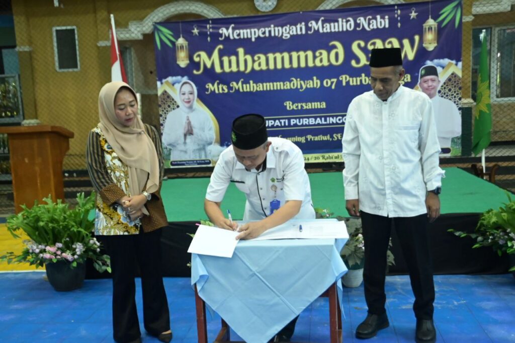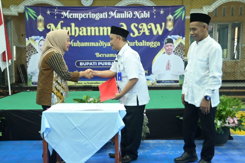 PURBALINGGA – Bupati Purbalingga Dyah Hayuning Pratiwi menghibahkan bus aset milik Pemkab Purbalingga kepada pihak MTs Muhammadiyah 07 Purbalingga. Penyerahan ditandai dengan penandatanganan berita acara yang diselenggarakan bersamaan acara Pengajian memperingati Maulid Nabi Muhammad SAW di GOR Indoor MTs Muhammadiyah 07 Purbalingga di Kecamatan Kejobong, Selasa (2/9/2024).