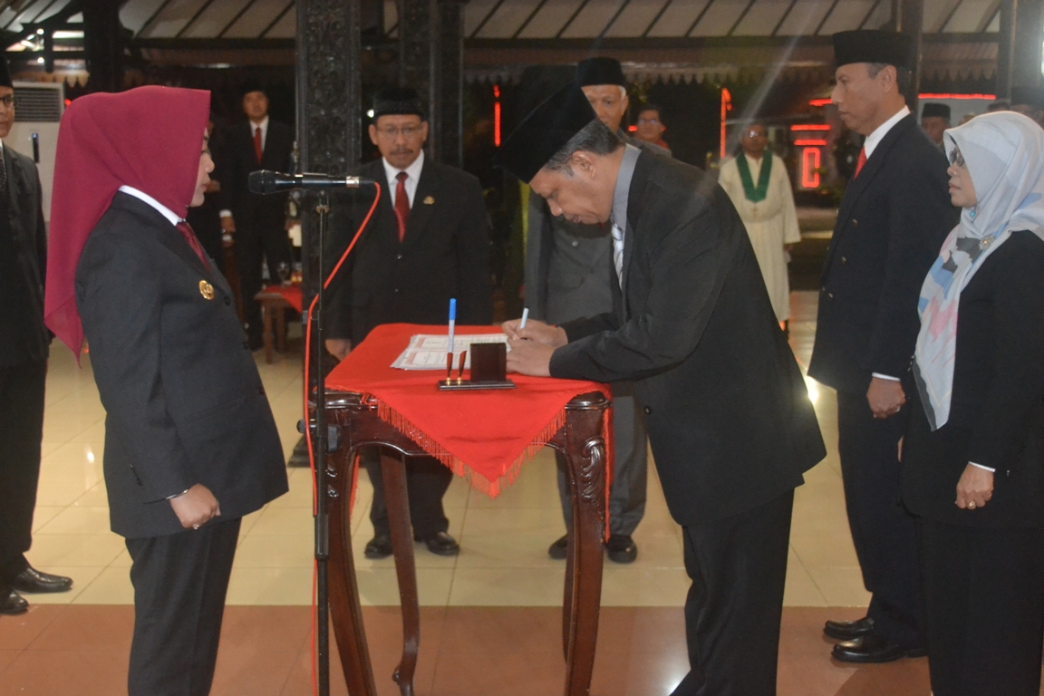 PURBALINGGA – Bupati Purbalingga Dyah Hayuning Pratiwi SE BEcon MM melantik sebanyak 109 pejabat struktural di lingkungan Pemerintah Kabupaten Purbalingga, Jumat malam (19/7) di Pendopo Dipokusumo. Mereka yang dilantik, 7 diantaranya pejabat yang dipromosikan dari Eselon III ke Eselon II dan sisanya, 102 pejabat merupakan hasil penataan/mutasi maupun promosi dari Eselon IV ke Eselon III.