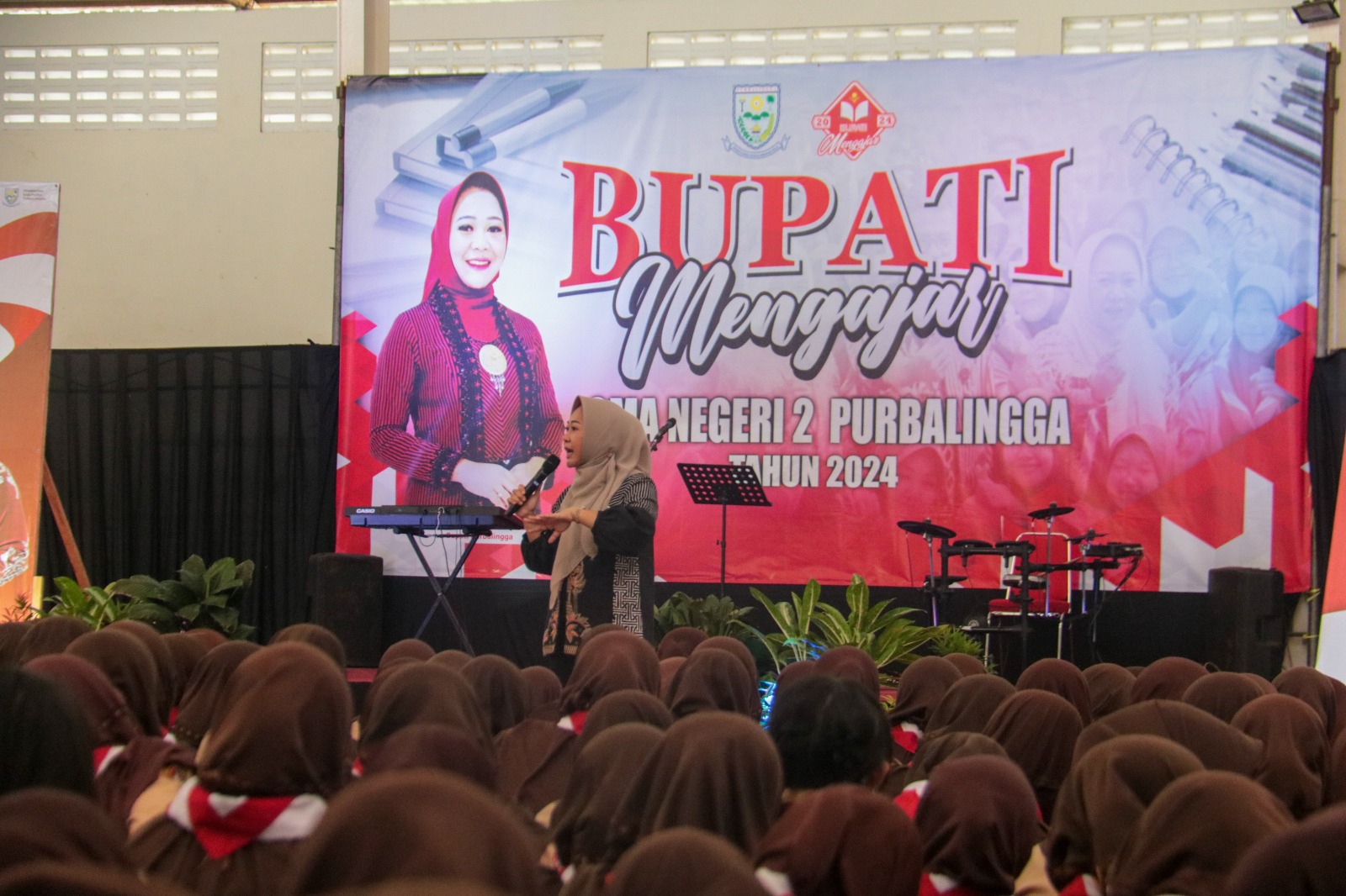 PURBALINGGA INFO – Bupati Purbalingga, Dyah Hayuning Pratiwi (Tiwi) melaksanakan kegiatan “Bupati Mengajar” di Aula SMA Negeri 2 Purbalingga, Jumat (14/6/24). Kegiatan ini bertujuan untuk memberikan semangat dan motivasi kepada para siswa, serta meningkatkan pemahaman mereka mengenai wawasan kebangsaan.