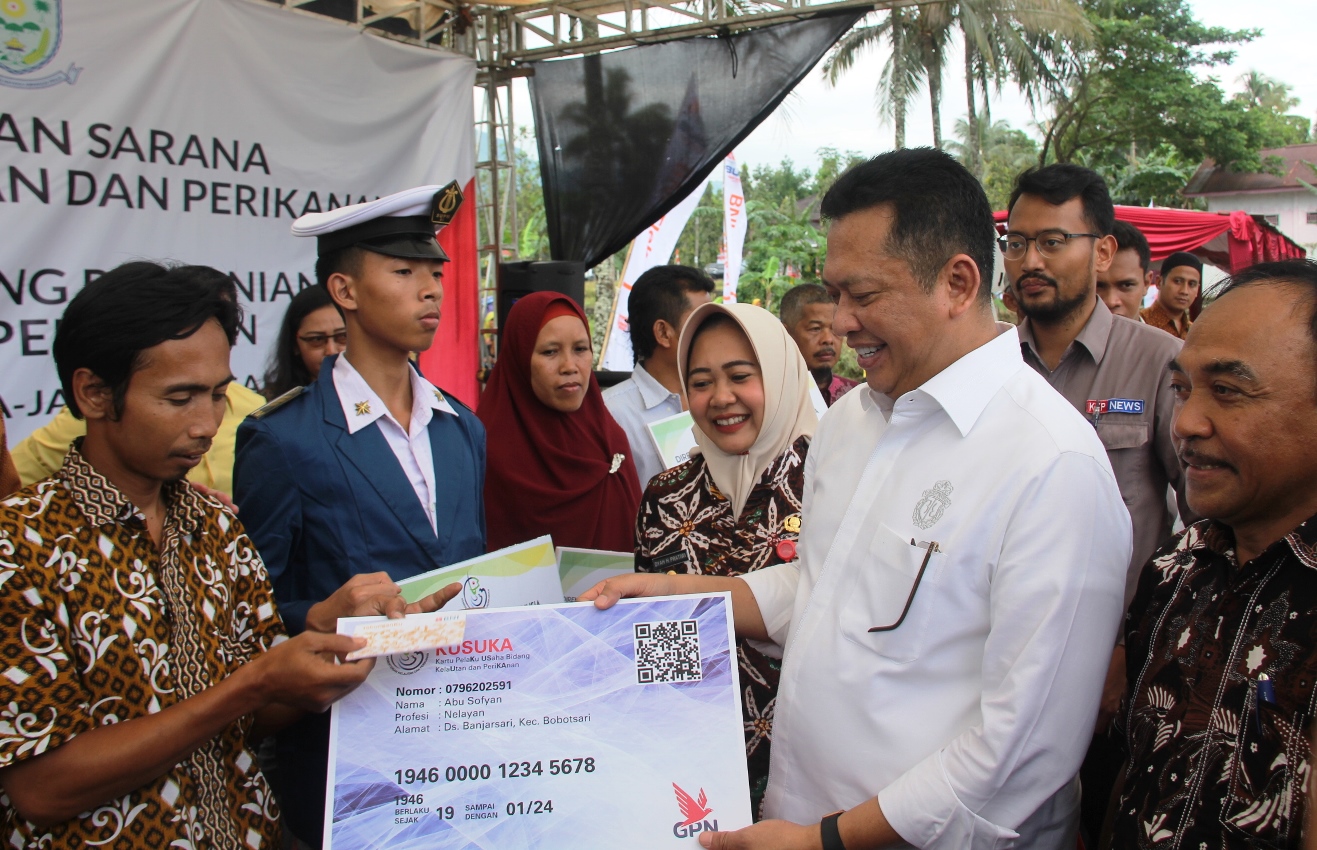 PURBALINGGA- Kabupaten Purbalingga mendapatkan bantuan sejumlah Rp 2 miliar 847 juta dari Kementerian Kelautan dan Perikanan berupa bantuan sarana bidang kelautan dan perikanan sejumlah Rp 1 miliar 461 juta dan bantuan dari Kementerian Pertanian berupa Bantuan Alsintan Pra Panen dari Ditjen Prasarana Dan Sarana Pertanian, dan bantuan Alsintan Pasca Panen dari Ditjen Tanaman Pangan sejumlah Rp 1 miliar 386 juta. Bantuan tersebut diterima oleh para penerima manfaat pada acara penyerahan bantuan sarana bidang kelautan perikanan dan bantuan alat dan mesin pertanian dalam rangkaian kunjungan kerja Anggota IV BPK RI dan Ketua DPR RI di lapangan Desa Limbasari Kec Bobotsari, Jumat (15/03).