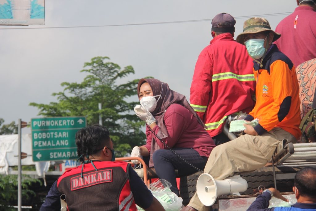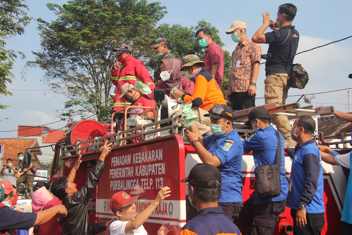 Masyarakat dibuat kaget ketika mendengar pengeras suara dari atas truk damkar ternyata suara bupati yang sudah akrab diteliga warga. Sambil melakukan sosialisasi dibagikan pula masker dan handsanitizer kepada warga disepanjang jalan yang dilalui.