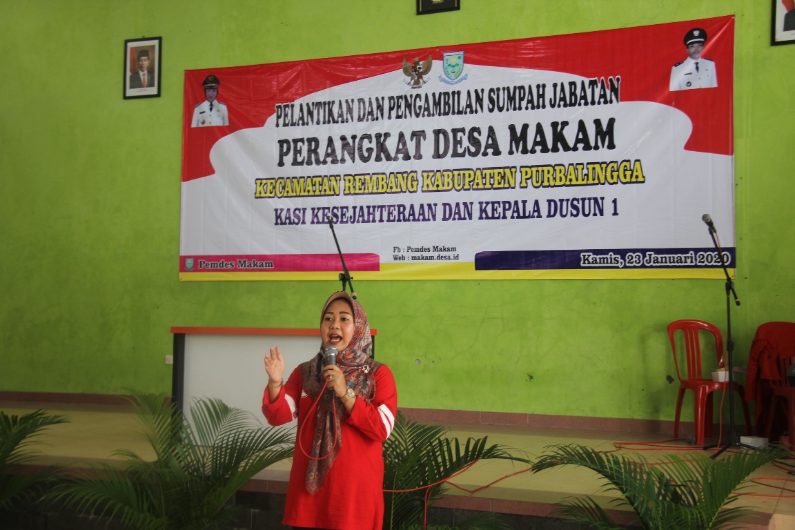 PURBALINGGA_Bupati Purbalingga Dyah Hayuning Pratiwi mengingatkan pada perangkat desa Makam Kecamatan Rembang yang dilantik untuk menjaga kondusifitas wilayah, menjaga persatuan dan kesatuhan serta keguyubrukunan, karena merupakan modal bagi pemerintahan desa dalam menjalankan roda pemerintahan dan pembangunan. Hal disampaikan bupati yang biasa di panggil Tiwi saat menghadiri Pelantikan dan Pengambilan Sumpah Jabatan Perangkat Desa Makam Kecamatan Rembang, Kamis (23/1). Terlantik adalah Imam Setiono selaku Kepala Dusun I dan Kartika Nurul Utami selaku Kasi Kesejahteraan, desa setempat.