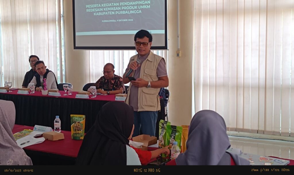 PURBALINGGA INFO – Dinas Perindustrian dan Perdagangan (Dinperindag) Kabupaten Purbalingga bekerja sama dengan Balai Pelatihan SDM Metrologi, Mutu dan Jasa Perdagangan (BPMJP) Kementerian Perdagangan RI serta Universitas Pendidikan Indonesia (UPI) menggelar kegiatan pendampingan Redesain Kemasan Produk UMKM Kabupaten Purbalingga. Kegiatan berlangsung di Aula UPTD Pengembangan Industri Logam (Pilog), Kamis (9/10/2025).