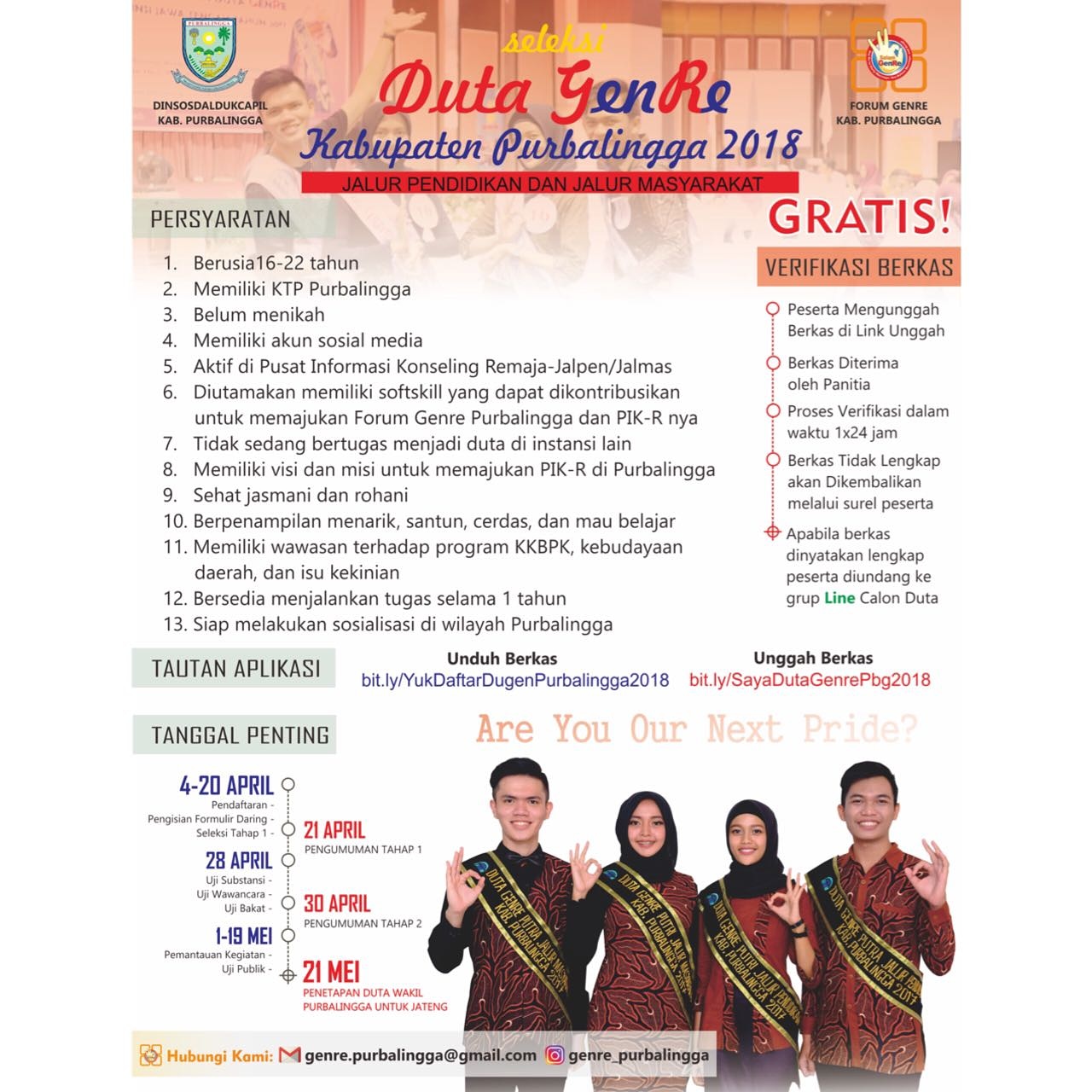 Hal itu disampaikan oleh salah panitia Duta Genre Purbalingga 2018 yang juga Kasi Kesejahteraan Keluarga pada Dinsosdalduk KB P3A Puji Sri Rahayu saat ditemui diruang kerjanya, Kamis (5/4). Tujuan Lomba menurut Puji untuk menyebarkan secara luas program Genre di kalangan remaja agar memiliki pengetahuan prilaku, sikap yang positif dalam pengembangan mental dan spiritual yang positif.