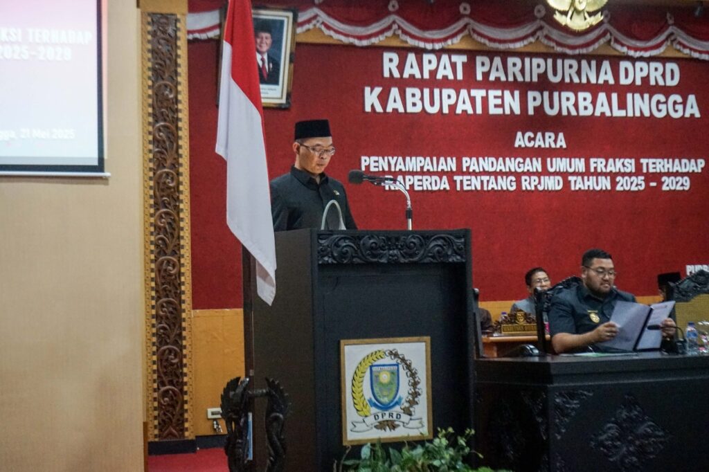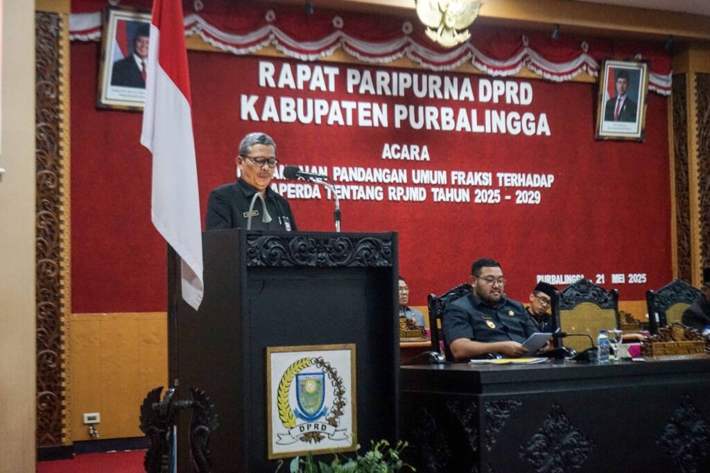 PURBALINGGA INFO – DPRD Kabupaten Purbalingga menggelar rapat paripurna dengan agenda penyampaian pandangan umum fraksi-fraksi terhadap Rancangan Peraturan Daerah (Raperda) Rencana Pembangunan Jangka Menengah Daerah (RPJMD) Tahun 2025–2029, Rabu (21/5/25).