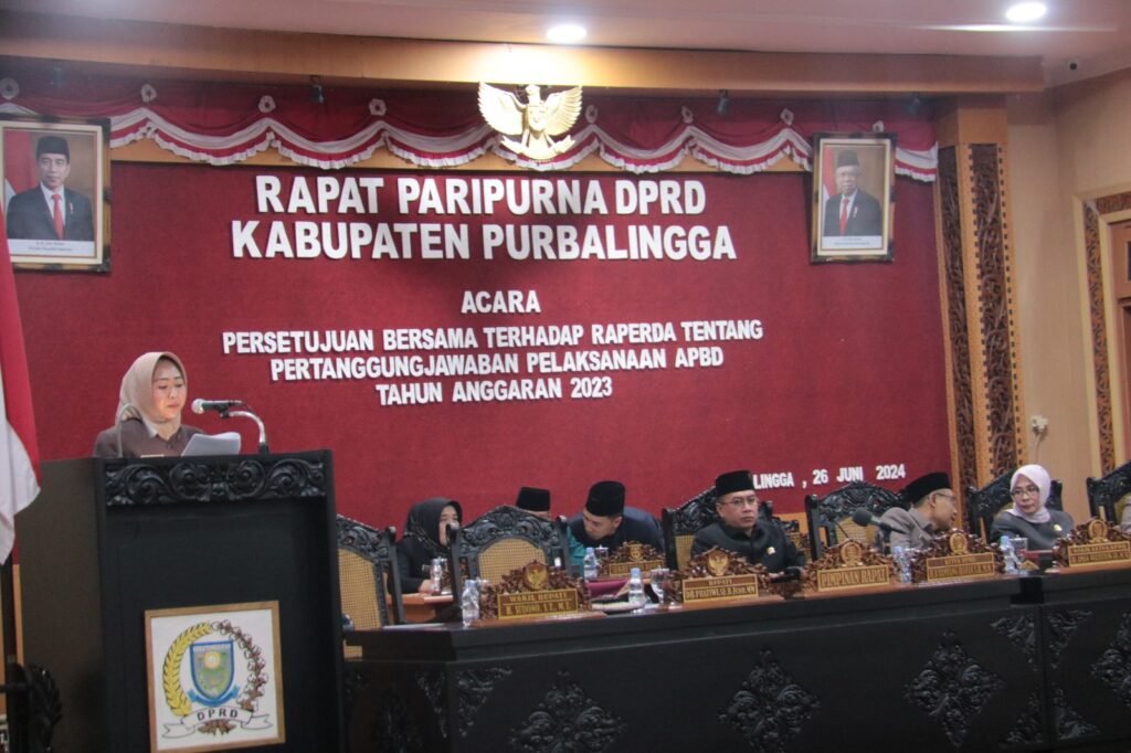 “Perlu kami sampaikan bahwa DPRD Kabupaten Purbalingga bersama dengan Pemerintah Daerah telah melaksanakan pembahasan terhadap Raperda tentang Pertanggungjawaban Pelaksanaan APBD tahun anggaran 2023, baik pada tiga komisi dengan organisasi perangkat daerah, komisi dengan badan anggaran, maupun badan anggaran dengan tim anggaran Pemerintah Daerah,” katanya.