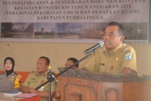 PURBALINGGA – Dinas Pekerjaan Umum dan Penataan Ruang (DPUPR) Kabupaten Purbalingga bersama rekanan jasa konstruksi, tandatangani sejumlah dokumen kontrak kerja, Selasa (22/5). Penandatanganan dan penyerahan dokumen secara simbolis yang terselenggara di Aula DPUPR ini menjadi penanda dimulainya pekerjaan konstruksi di Kabupaten Purbalingga, khususnya tahun anggaran 2018.