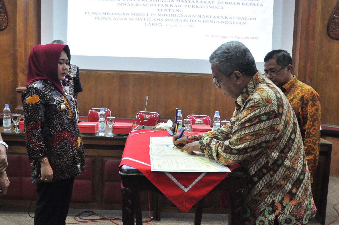 Kerjasama ini diawali dengan penandatanganan Memorandum of Understanding (MoU) antara Bupati Purbalingga dengan Kepala Balitbangkes Kemenkes RI. Selain itu juga Perjanjian Kerja Sama antara Kepala Dinas Kesehatan Purbalingga dengan Kepala Puslitbang Upaya Kesehatan Masyarakat tentang Pengembangan Model Pemberdayaan Masyarakat Dalam Penguatan Surveilans Migrasi dan Pengendalian Larva Anopheles spp.