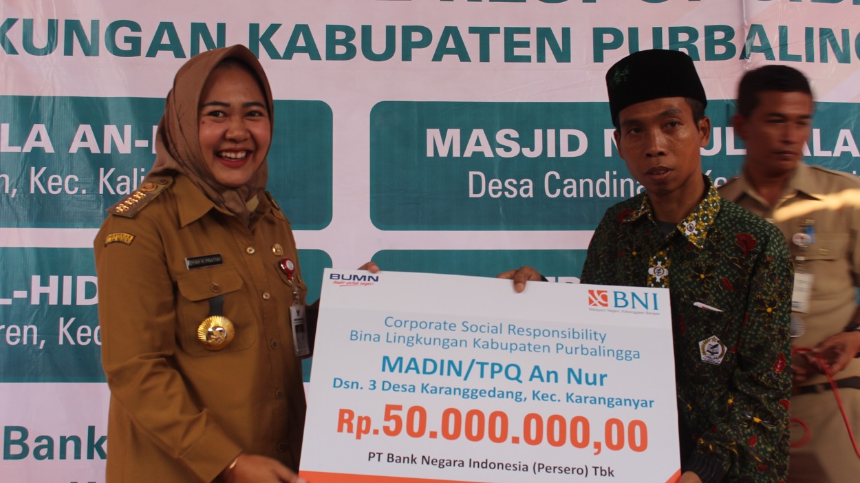 “Adanya CSR untuk Karanggedang tidak terlepas dari upaya ibu bupati (Dyah Hayuning Pratiwi-red) atas permintaan dukungan CSR kepada Menteri BUMN untuk rehabilitasi tempat ibadah dan TPQ. Dan hari ini kami merealisasikan untuk TPQ An Nur Desa Karanggedang ini,” ujar Pemimpin Cabang Bank BNI Purbalingga Antonius Eko Hariwiyoto usai menyerahkan tanggung jawab social perusahaan itu di komplek TPQ An Nur Karanggedang, Selasa (10/9).