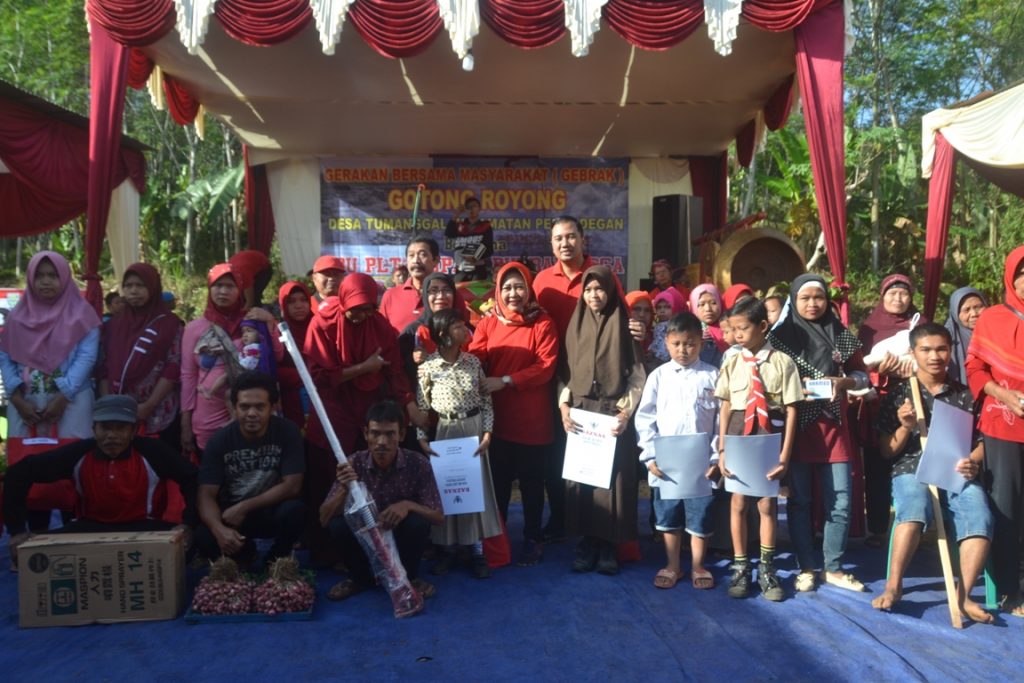 PURBALINGGA – Gerakan Bersama Masyarakat (Gebrak) Gotong Royong yang diselenggarakan Pemerintah Kabupaten Purbalingga kali ini ditempatkan di Desa Tumanggal, Pengadegan, Sabtu (4/8). Berbagai kegiatan yang dilaksanakan bersama masyarakat setempat ini diantaranya mulai dari serah terima bantuan pemugaran Rumah Tidak Layak Huni (RTLH), Pemberantasan Sarang Nyamuk (PSN), penebaran benih ikan, peletakan batu pertama pembangunan talud lapangan, dan penanaman pohon kayu di sekitar lapangan.