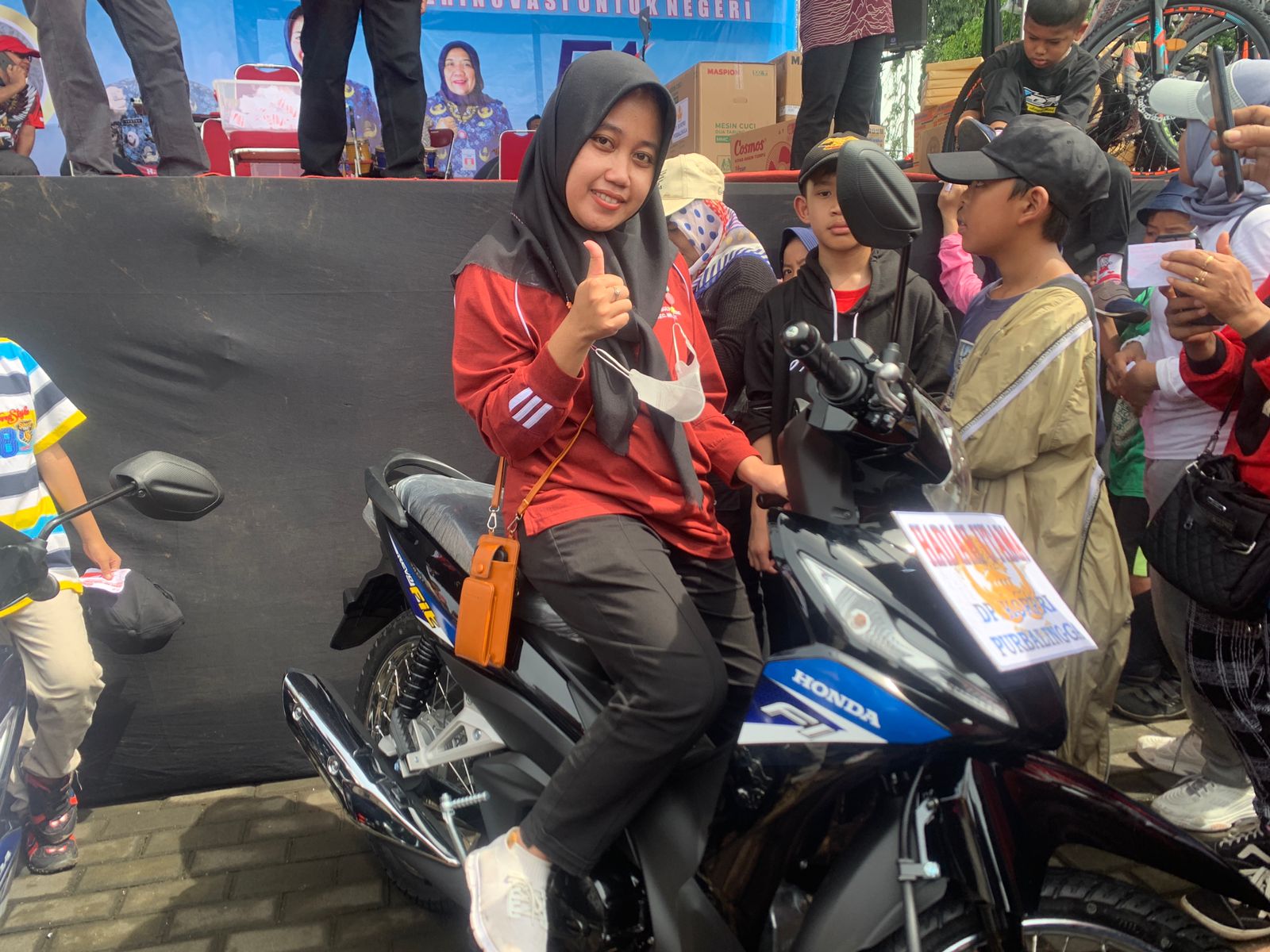Mely, mendapatkah hadiah utama sepeda motor yang diserahkan langsung oleh Bupati Purbalingga Dyah Hayuning Pratiwi.