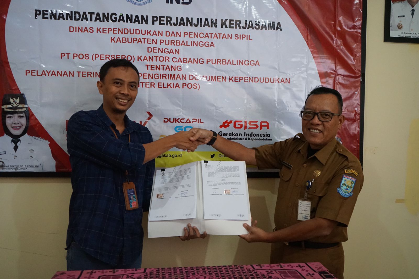 Salah satu langkah yang ditempuh adalah kembali melakukan kerja sama dengan PT. POS Cabang Purbalingga melalui inovasi Anter Elkia. Penandatanganan kerja sama dilakukan di Kantor Dipendukcapil Purbalingga oleh Kepala Dipendukcapil dan Executive Manager PT. POS Cabang Purbalingga, Senin (6/5).