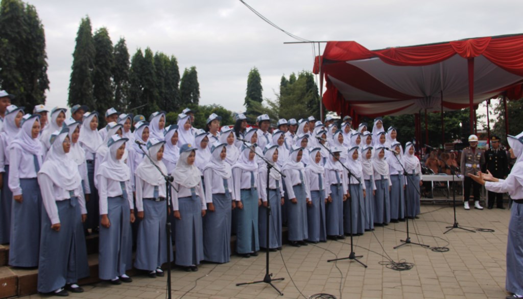 PURBALINGGA, INFO- Siswa-siswi SMA Negeri 2 Purbalingga yang tergabung dalam kelompok paduan suara, menjadi tim aubade upacara penurunan bendera kebesaran dalam rangka memperingati hari ulang tahun ke 72 proklamasi kemerdekaan Republik Indonesia tingkat Kabupaten Purbalingga di alun-alun Purbalingga, Kamis sore (17/08).