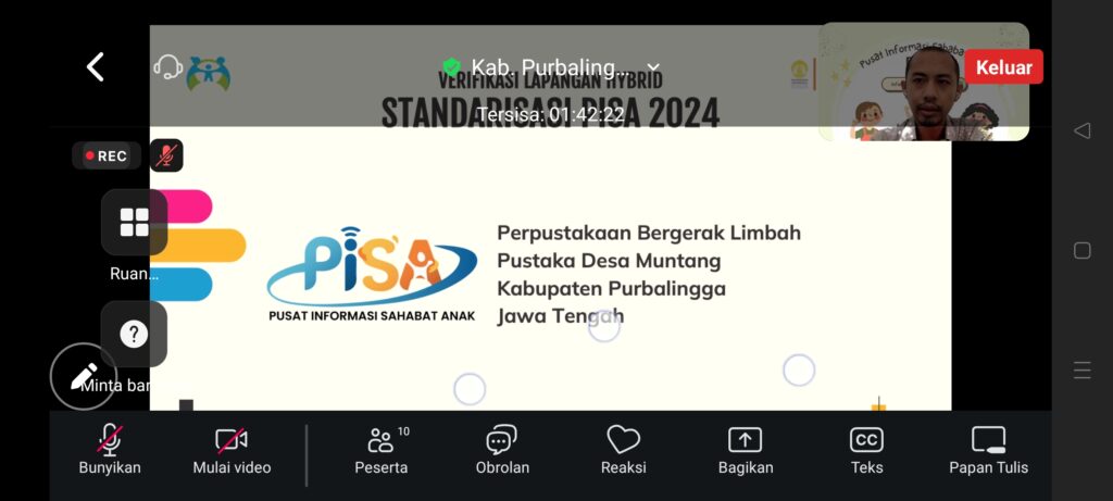 PURBALINGGA INFO – Kementerian Pemberdayaan Perempuan dan Perlindungan Anak Republik Indonesia bersama dengan Lembaga Penelitian dan Pengembangan Sosial dan Politik (LPPSP) Universitas Indonesia (UI) melakukan verifikasi lapangan (verlap) terhadap dua lembaga perpustakaan di Kabupaten Purbalingga. Verifikasi lapangan ini merupakan bagian dari Standarisasi Pusat Informasi Sahabat Anak (PISA) Tahun 2024 yang dilakukan secara hybrid melalui aplikasi Zoom Meeting, Kamis (14/11/24).
