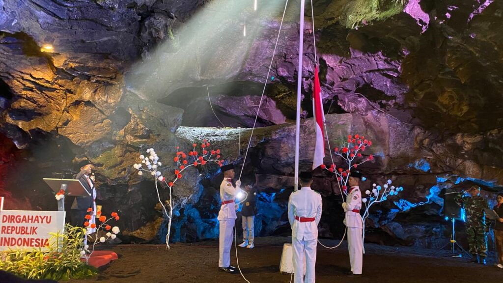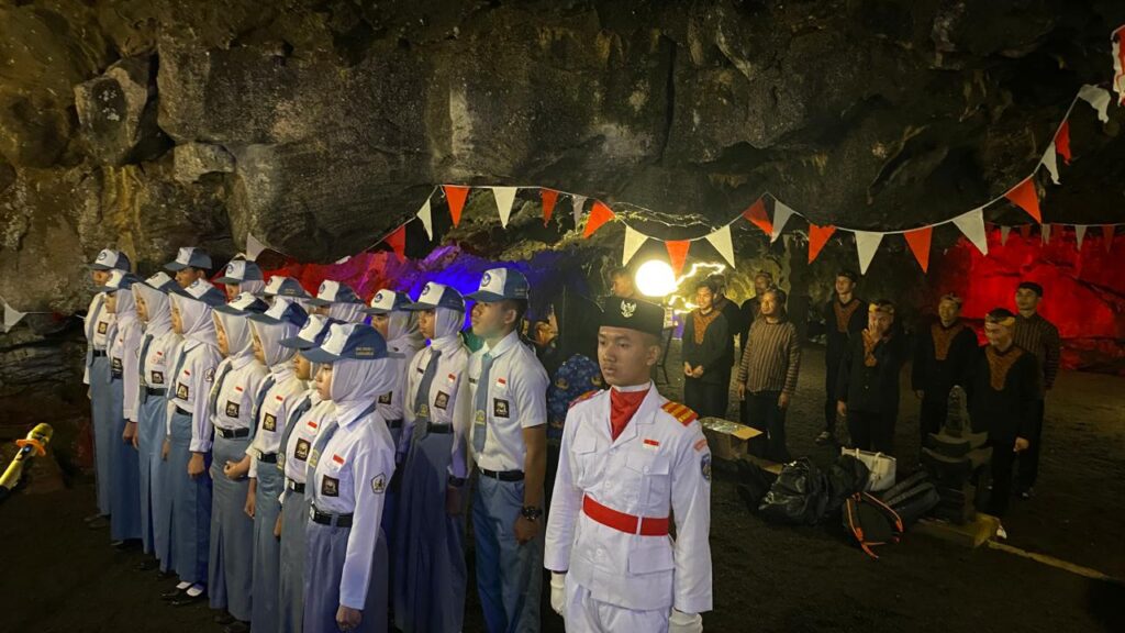 Prosesi pengibaran Bendera Merah Putih di dalam Goa Lawa Purbalingga