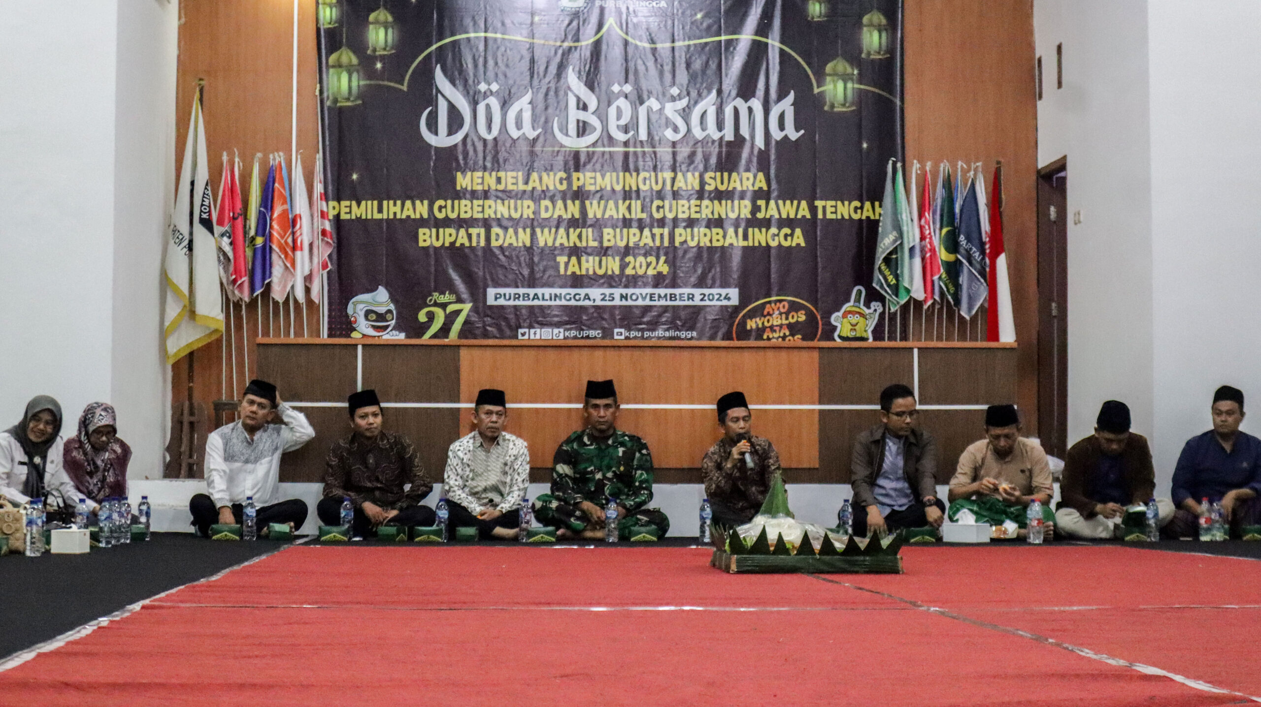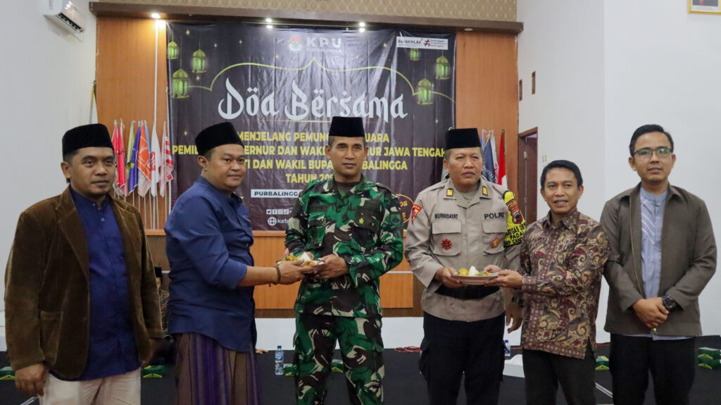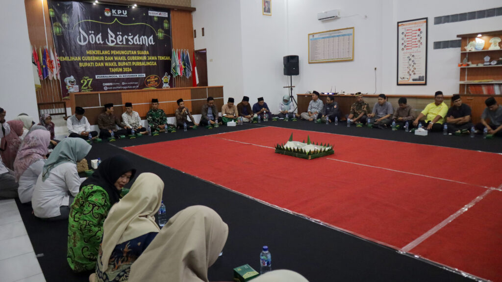 PURBALINGGA – Menjelang pelaksanaan pemungutan suara pemilihan Gubernur dan Wakil Gubernur Jawa Tengah, Bupati dan Wakil Bupati Purbalingga tahun 2024, Komisi Pemilihan Umum (KPU) Kabupaten Purbalingga menggelar doa bersama pada Senin (25/11/2024) malam, bertempat di Aula KPU Purbalingga. Acara tersebut menjadi salah satu ikhtiar dan memohon kepada Tuhan Yang Maha Esa agar gelaran pesta demokrasi pada Hari Rabu, tanggal 27 November 2024 mendatang dapat berjalan lancar, aman, dan damai.