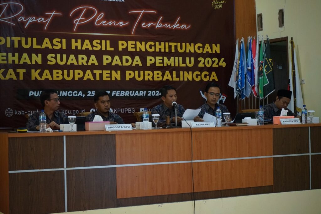 PURBALINGGA, INFO – Komisi Pemilihan Umum (KPU) Kabupaten Purbalingga melaksanakan rapat pleno terbuka hasil rekapitulasi Pemilu 2024 selama 3 hari, yakni Minggu-Selasa (25-27/2). Rapat tersebut diselenggarakan di Aula Kantor KPU Purbalingga, Desa Penaruban Kecamatan Kaligondang.