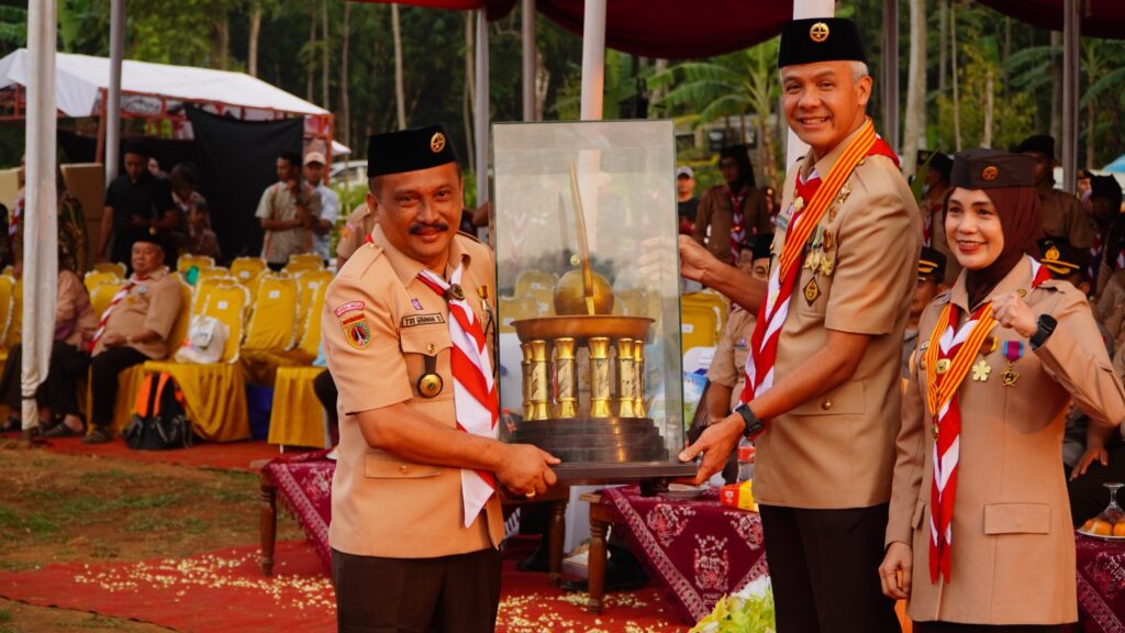 Ketua Kwarcab Purbalingga, Tri Gunawan Setyadi menerima langsung piala bergilir juara umum Estafet Tunas Kelapa dari ketua Mabida Jawa Tengah, Ganjar Pranowo didampingi oleh ketua Kwarda Jawa Tengah, Siti Atikoh Supriyanti di obyek wisata Bukit Tangkeban, Pemalang. (30/8/23).