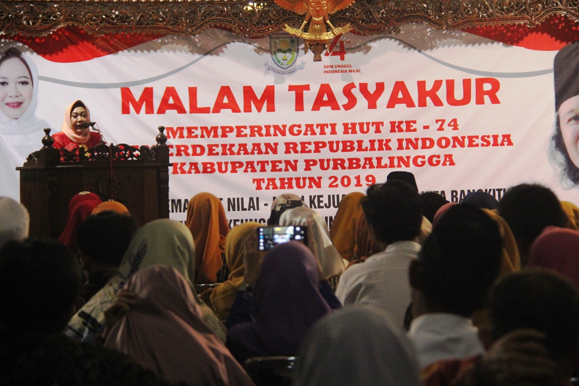 “Melalui kesempatan momentum tasyakur kita jadikan pembangkit semangat kejuangan untuk meraih keunggulan Purbalingga,” demikian disampaikan Bupati Purbalingga Dyah Hayuning Pratiwi SE BEcon MM dalam sambutannya pada malam tasyakur memperingati hari ulang tahun ke 74 kemerdekaan RI tahun 2019 di pendopo Dipokusumo, Jum’at malam (16/08).