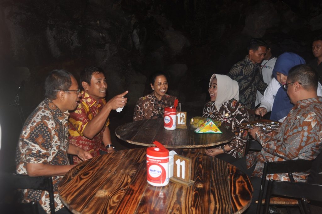 Menteri Rini juga mengakui baru kali ini ia berkunjung ke kafe yang lokasinya berada di goa vulkanik. “Tempat lain kafe di dalam goa, saya belum pernah . Sebelumnya pernah kesini pas lagi puasa jadi kafenya tutup. Alhamdulillah sekarang bisa nyoba. Kesannya keren, keren, benar-benar pengalaman tersendiri, new experience.” ungkapnya.