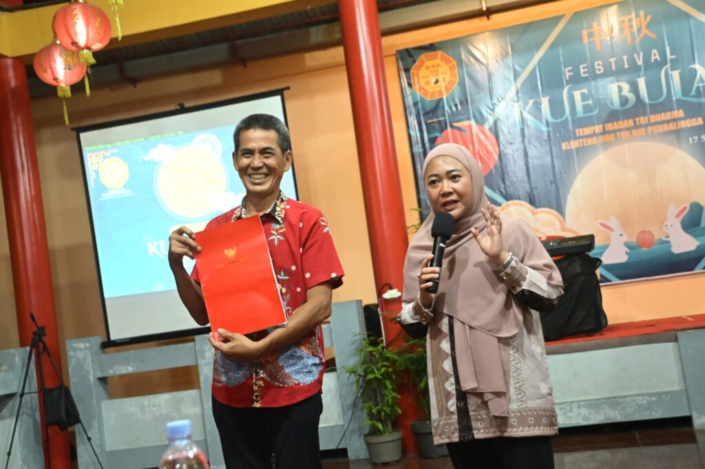 PURBALINGGA – Bupati Purbalingga Dyah Hayuning Pratiwi menghadiri Festival Kue Bulan yang diselenggarakan oleh warga Tionghoa di Klenteng TITD Hok Tek Bio Purbalingga, Kelurahan Purbalingga Kulon, Selasa (17/9/2024). Bupati Tiwi menyapa dan turut mencicipi Kue Bulan yang dibagi-bagikan kepada siapa saja yang hadir.