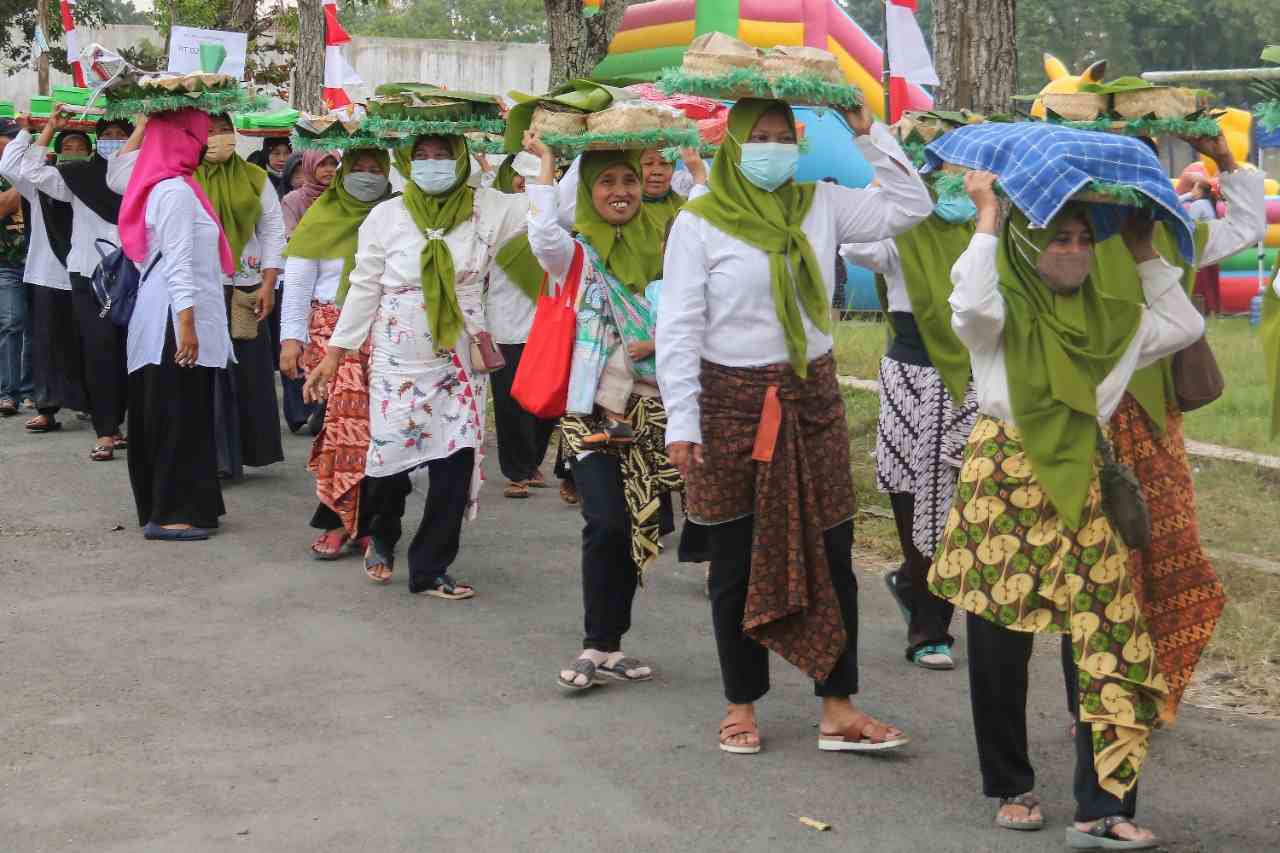 Ratusan masyarakat berjalan beriringan menuju lapangan Desa Blater dengan memanggul Gunungan berisi berbagai hasil bumi seperti sayur mayur dan buah-buahan. Selain itu mereka juga membawa tenong berisi makanan untuk kemudian disuguhkan kepada pengunjung yang hadir.